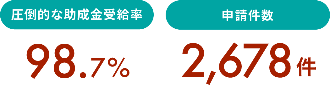 当社の事業の柱は、公的助成金の申請代行です。助成金の申請件数(2,678件、受給率98.7%)は都内トップクラスの実績を誇ります。国の助成金だけでなく、取得が難しいとされる「東京都の助成金」にも強いです。